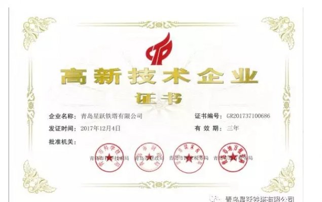 青島星躍鐵塔有限公司于近日收到由青島市科學技術局、青島市財政局、青島市國家稅務局、青島市地方稅務局聯合頒發的《高新技術企業證書》